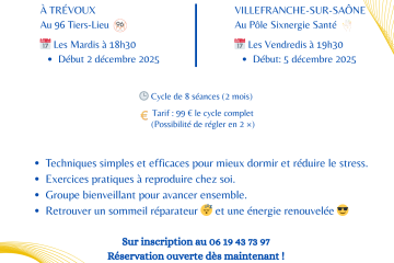 Améliorez votre sommeil et retrouvez votre énergie ! Un cycle de 8 séances collectives vous est proposé pour vous accompagner vers un apaisement nocturne Un parcours progressif conçu pour un petit groupe, afin de favoriser Lire la suite…